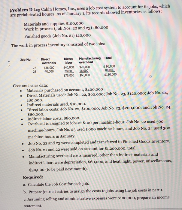 Solved Problem D Log Cabin Homes Inc Uses A Job Cost S